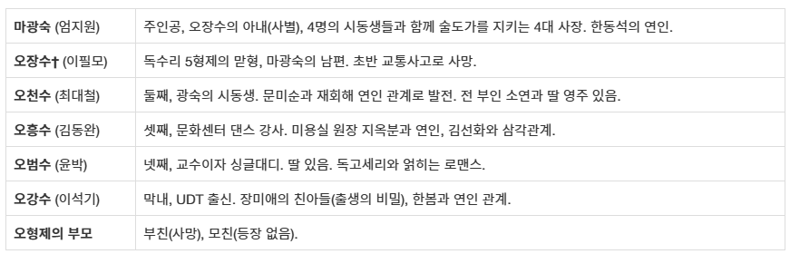 - 오흥수(김동완): 셋째, 댄스 강사, 미용실 원장과 삼각관계